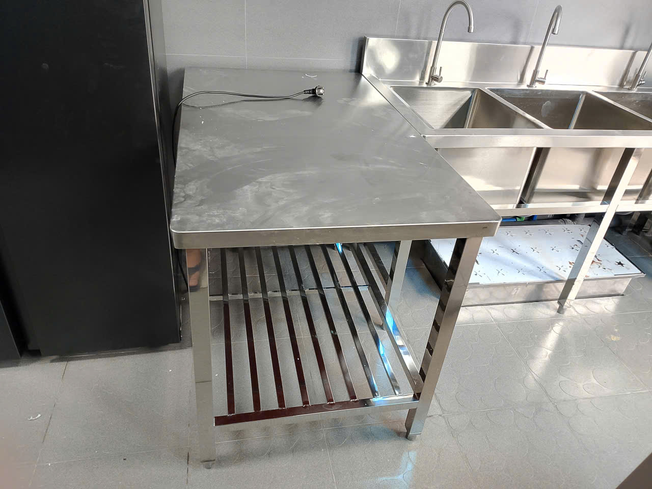 thi công bếp ăn công nghiệp công ty UNIND Bình Phước 2025 lắp đặt bàn sơ chế inox 2 tầng