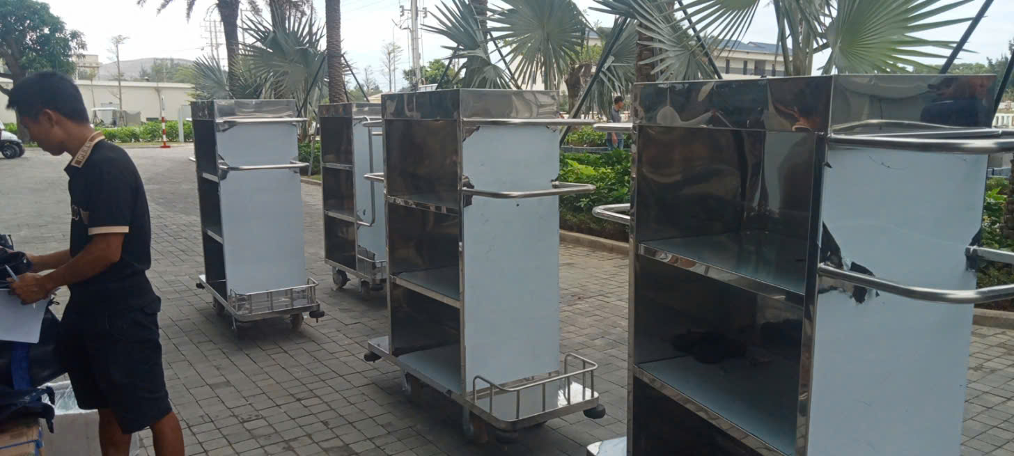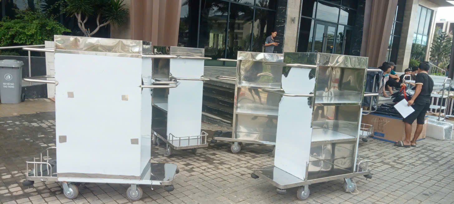 Xe đẩy hành lý: Kiểu dáng và chất liệu (inox mạ vàng, thép sơn tĩnh điện) phù hợp với tiêu chuẩn. Đây là “trợ lý thầm lặng” của đội lễ tân – hành lý; khung vững, bánh xe êm và viền cao su chống va đập sẽ bảo vệ tường – thang máy và giữ không gian luôn mới. Phiên bản inox mạ vàng cho hình ảnh cao cấp, bền màu; thép sơn tĩnh điện là lựa chọn kinh tế, dễ bảo trì. Mặt sàn bọc thảm chống trượt hạn chế đổ vỡ, tay đẩy cao vừa tầm giảm mỏi vai khi thao tác liên tục. Cơ Khí Đại Việt sản xuất theo bản vẽ kỹ thuật riêng, đồng bộ màu hoàn thiện với tổng thể lobby để tăng tính nhận diện.