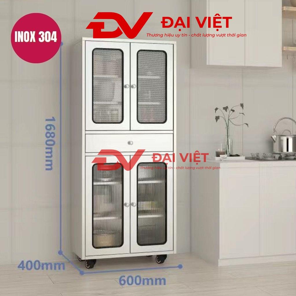 • Định nghĩa: Tủ đứng bằng Inox 304 có 4 cánh kính cường lực, nhiều ngăn lưu trữ (thường 12 ngăn + 2 ngăn kéo), dùng để đựng bát đĩa, đồ khô cho gia đình, căn hộ và bếp ăn nhỏ.